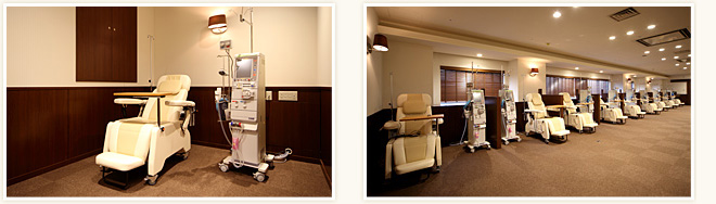 特に透析治療においては、「患者様の未来を応援する」をコンセプトにトータルケアを目指し、今までの透析施設にはない良質な透析医療を提供できるよう、最新の透析機器、シックで落ち着いたゆったりと寛げる透析室、また情報端末を豊富に揃え、安心の治療と自己創造の時間を有効活用できる快適な透析環境を整えています。